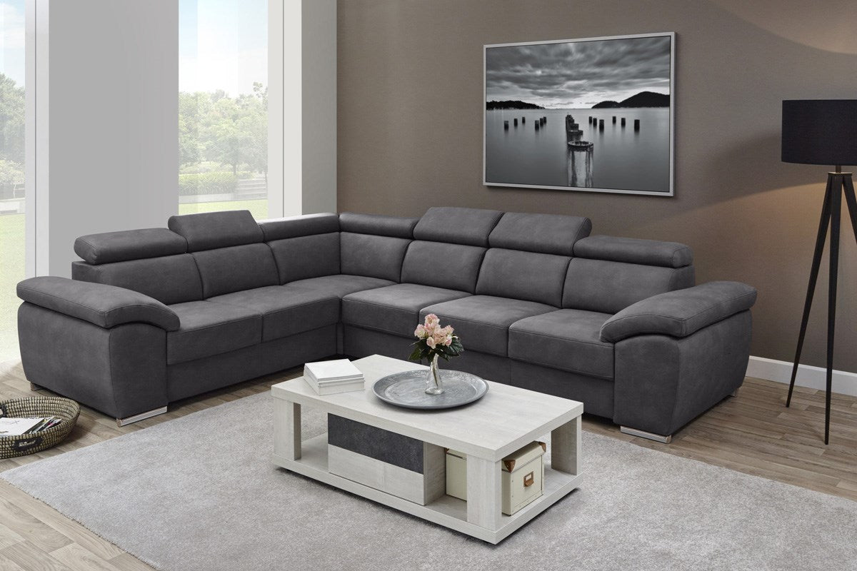 Apportez à votre salon une touche de raffinement avec le canapé d’angle DAMME, véritable alliance de confort et de modernité. Son revêtement en tissu Luxor gris, doux au toucher et résistant à l’usage quotidien, s’intègre harmonieusement dans tous les styles d’intérieur, du plus contemporain au plus classique.